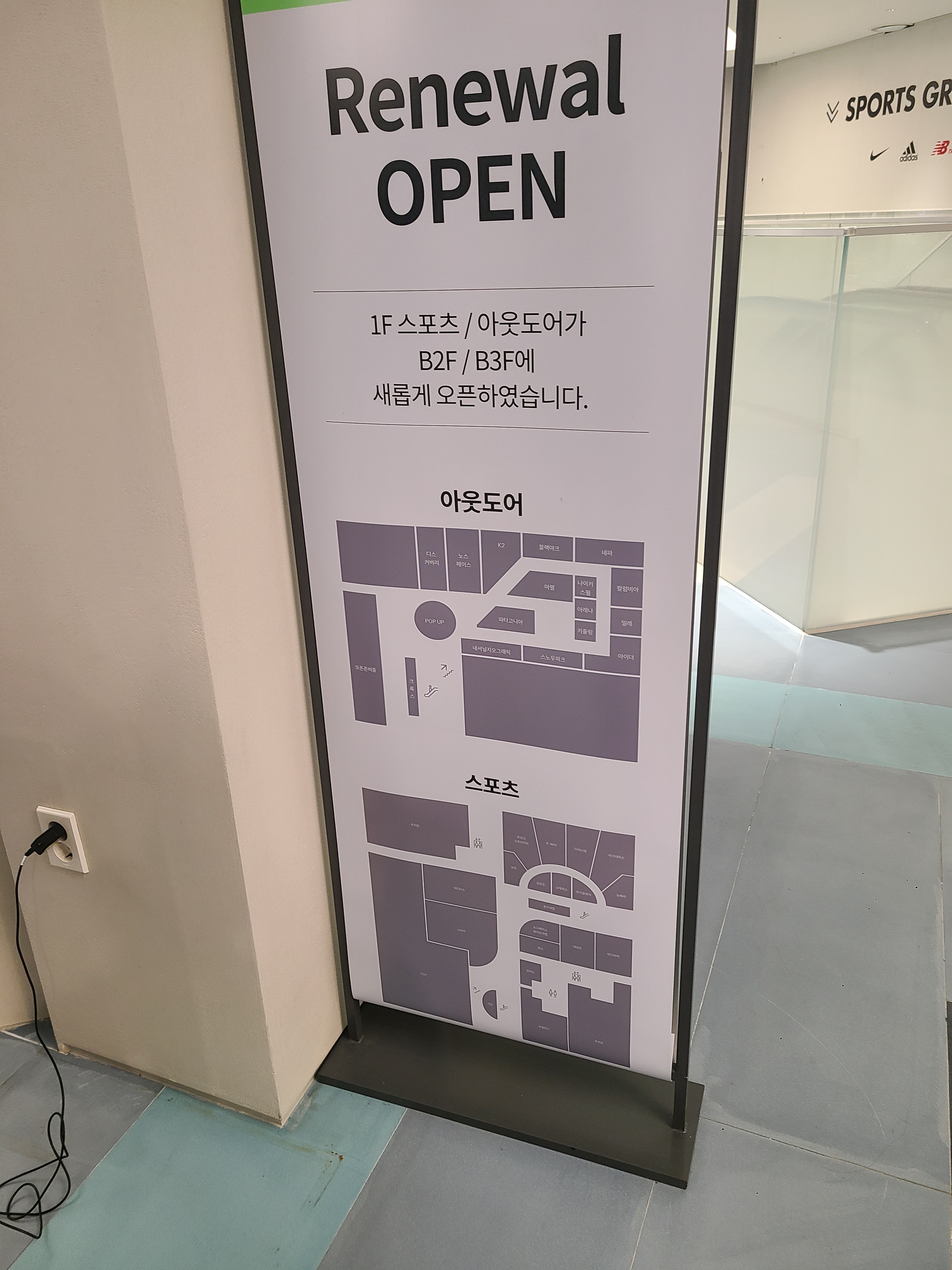 원래 1층에 있던 스포츠/아웃도어 매장이 이번 리모델링을 통해서 지하2층이랑 지하3층으로 옮겨갔다.