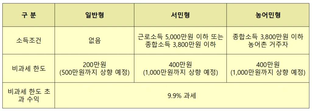 - 일반형 : 소득 여부와 무관하게 19세 이상의 국내 거주자와 15세 이상의 근로소득자가 가입하실 수 있습니다. 비과세 한도는 200만원(500만원으로 상향 예정)이며, 비과세 한도를 초과한 수익은 9.9%의 분리과세가 적용됩니다.