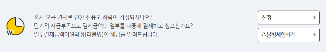 결제금액의 일부만 먼저 결제하고, 나머지는 나중으로 미루는 서비스이다. 이는 조금의 이자를 주면서 연체의 위험을 관리할 수 있는 제도이긴하다. 잘만 사용하면 연체로 인해 신용점수가 낮아질 위험을 방지할 수 있는 좋은 서비스이다. 하지만 좋은 것도 많이 먹으면 배탈이 나는 것처럼 리볼빙 제도도 많이 쓰다보면 문제가 생기기 마련이다.