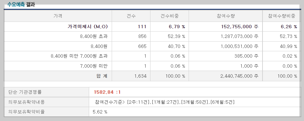 수요예측 경쟁률은 약 1580 : 1로 괜찮게 나왔네요.