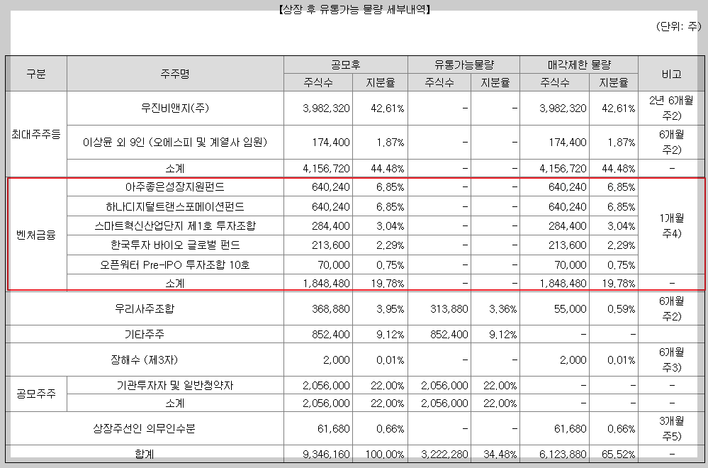 상장 후 유통 가능 물량은 34%정도 되네요.