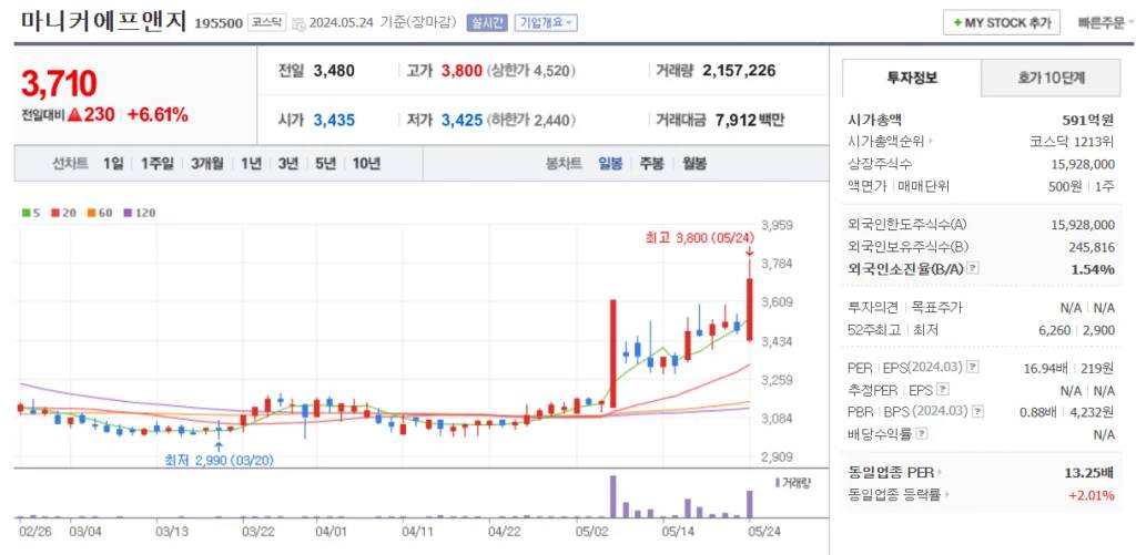 선정 이유: 마니커에프앤은 닭고기 관련 냉동/냉장식품 전문업체이며, 최근 유럽에 '삼계탕'을 공급한다는 소식에 급등한 기록이 있습니다. 치맥 판매 증가에 따른 닭고기 공급 증가를 고려하여 올림픽 관련주로 분류하였습니다.