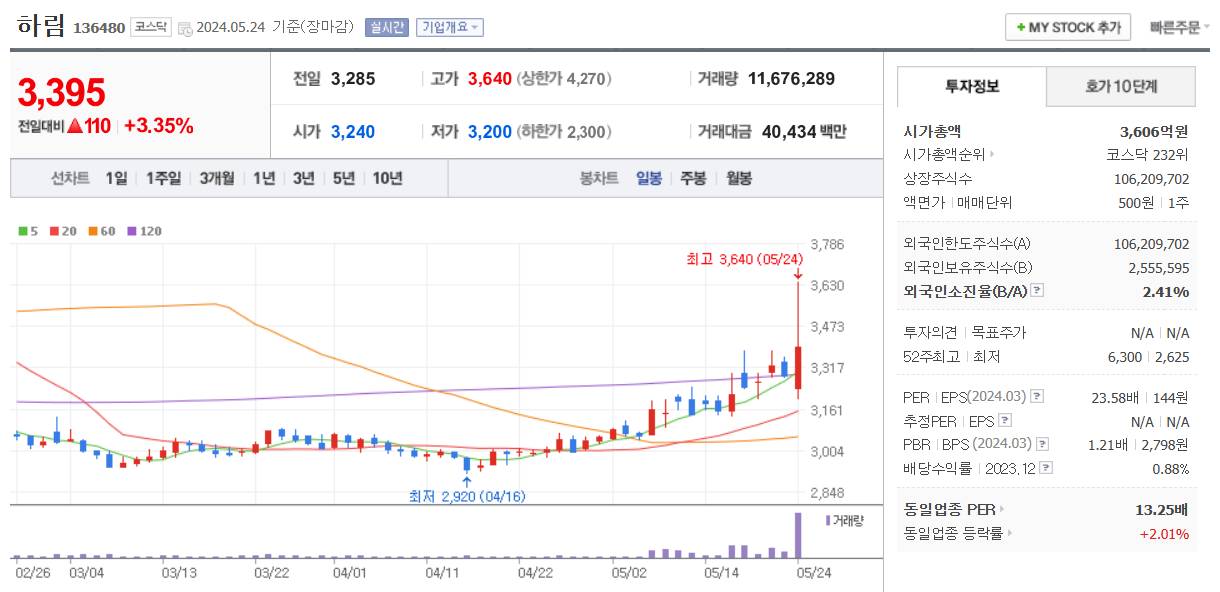 선정 이유: 하림은 양계와 육계 가공 사업을 수행하고 있습니다. 스포츠 행사 기간에는 치킨 판매량이 증가할 것으로 보여, 올림픽 기간에 주가가 상승할 가능성이 있습니다. 또한, 하림은 '팬오션'의 대주주로, 이 부분은 본업과 크게 관련이 없는 지분을 보유하고 있습니다. 그러나 최근에 HMM 인수 시도가 실패하면서 주가가 급락했습니다. 하림의 최근 주가 상승은 조선 및 해운 관련 산업의 호황 때문으로 보입니다.