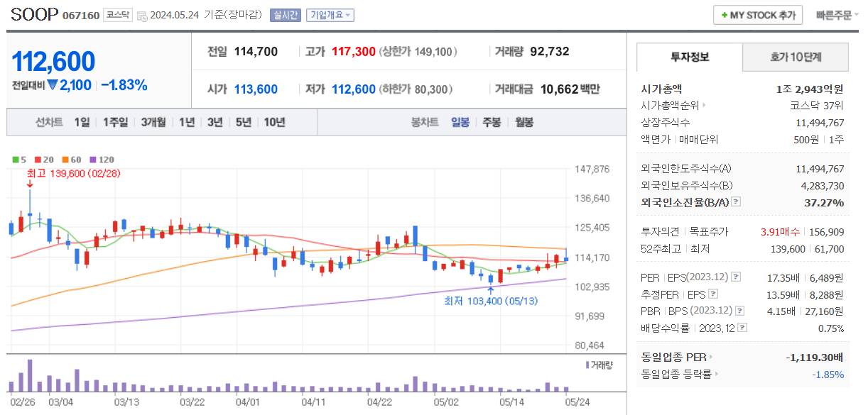 선정 이유: 최근 아프리카TV에서 사명을 변경한 SOOP은 방송 관련 주식입니다. 인터넷 방송이 그렇게 활발하지 않았던 시절, SBS는 중계권을 가지고 있었기 때문에 상승세를 보였습니다. 그러나 요즘에는 대형 스포츠 이벤트가 열릴 때마다 SOOP(아프리카TV) 주식이 좋은 반응을 보여주고 있습니다.