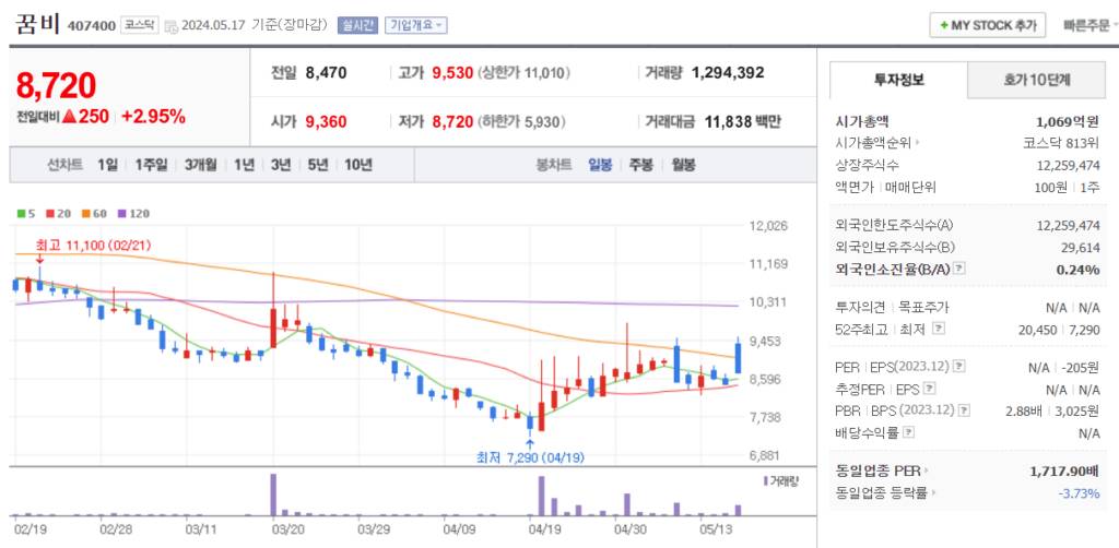 선정이유 : 꿈비는 유아용품의 제조 및 도소매를 주요 사업으로 하며, 그래서 저출산 관련주로 주목받는다. 꿈비는 GGUMBI, LICOCO, Organic ground등의 브랜드를 통해 놀이방 매트, 유아용 침구류, 원목 가구, 스킨케어, 세제, 반려동물 용품 등 다양한 제품을 제공한다. 저출산 대책이 발표될 때마다 민감하게 반응하는 꿈비는 이번에도 주목해볼 만한 종목입니다.