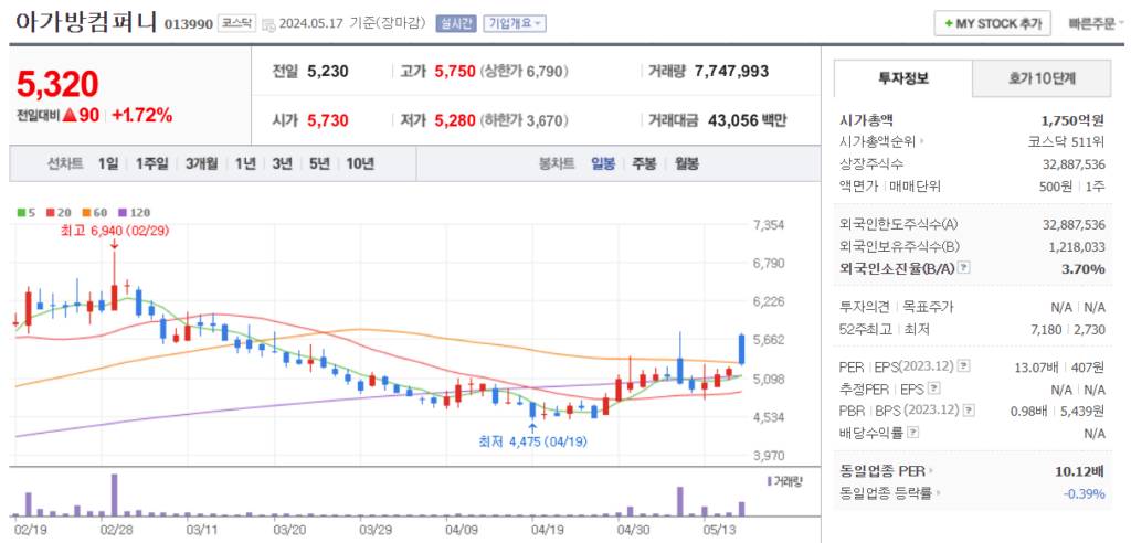 평균 거래량이 점차 증가하고 있고, 과거의 경우에 비추어 볼 때, 호재에 대해 민감하게 반응하는 종목이기 때문에, 주의 깊게 관찰해야 하는 종목입니다.
