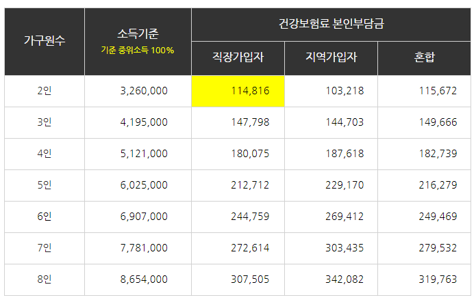 기준 중위소득 100% 2인가구의 건강보험료 114,816원 보다