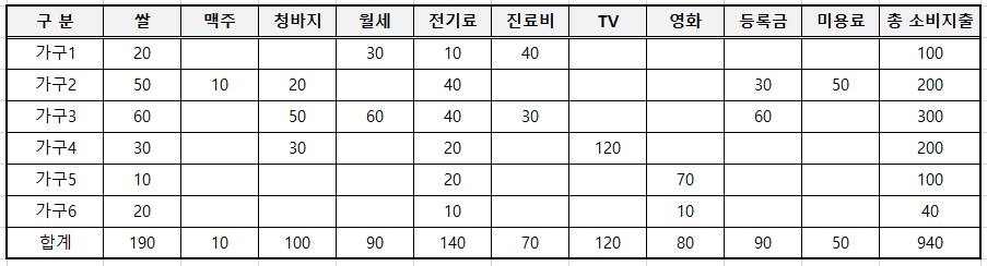 각 가구마다 소비하는 품목과 비용을 임의로 기재하였다.