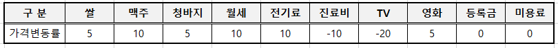 이때 각 변동률들을 단순히 단순평균한다고 가정하면, 동일한 10% 변동률을 보인 맥주와 월세는 같은 비중으로 들어가게 된다. 하지만 이는 맥주 가격과 월세 가격만 잠시 생각해봐도 합리적이지 않은 방법으로 보인다.