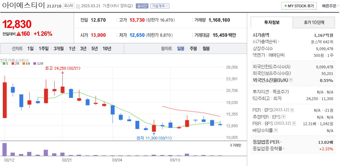 아이에스티이는 3월 21일 기준 1.26% 상승하며 154억의 거래대금을 기록했습니다^3. LPDDR5X 개발 중인 SK하이닉스가 주거래처로 주목받고 있습니다.